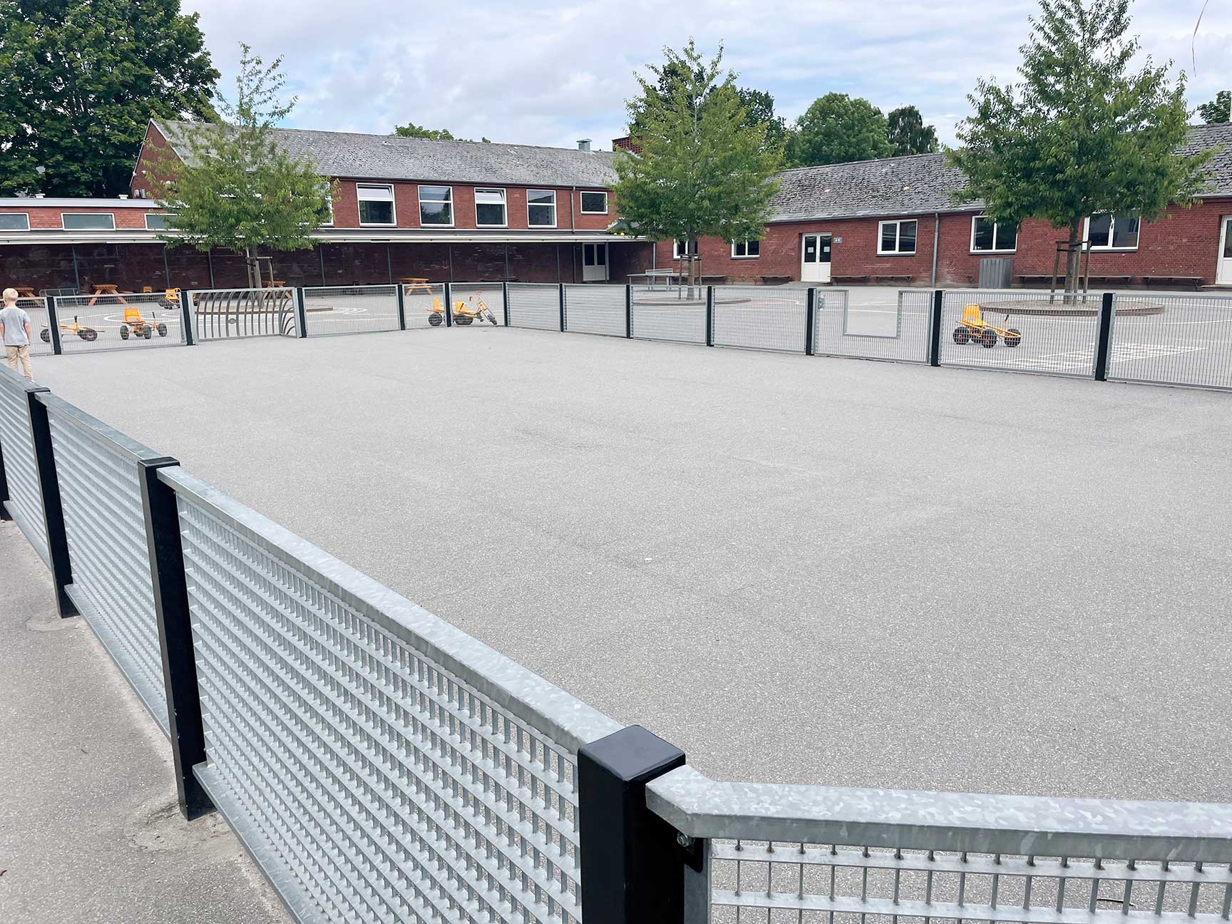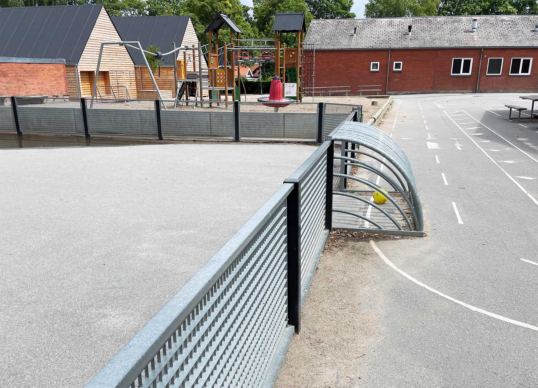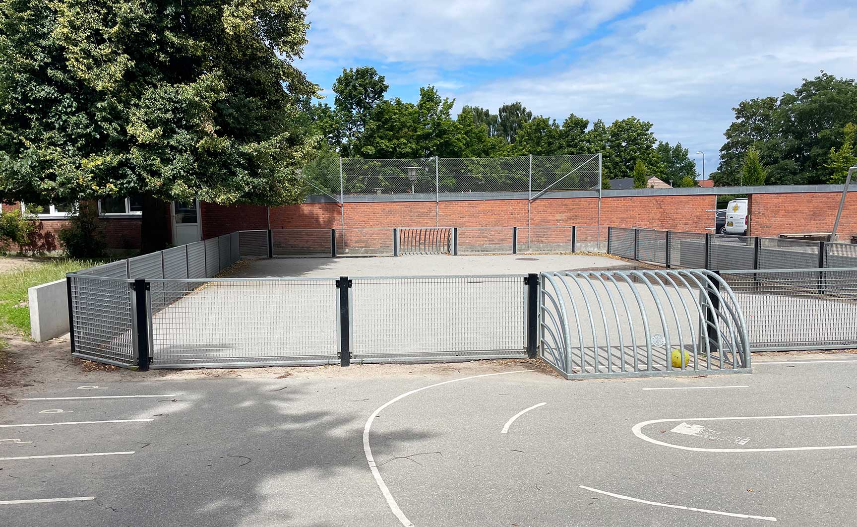 Skolen ønskede to lave omnistadiums til boldspil tilpasset udvalgte områder i skolegården – en opgave vi naturligvis fandt en god løsning på, som stadig står flot 6 år efter etablering og masser af dagligdagsbrug.