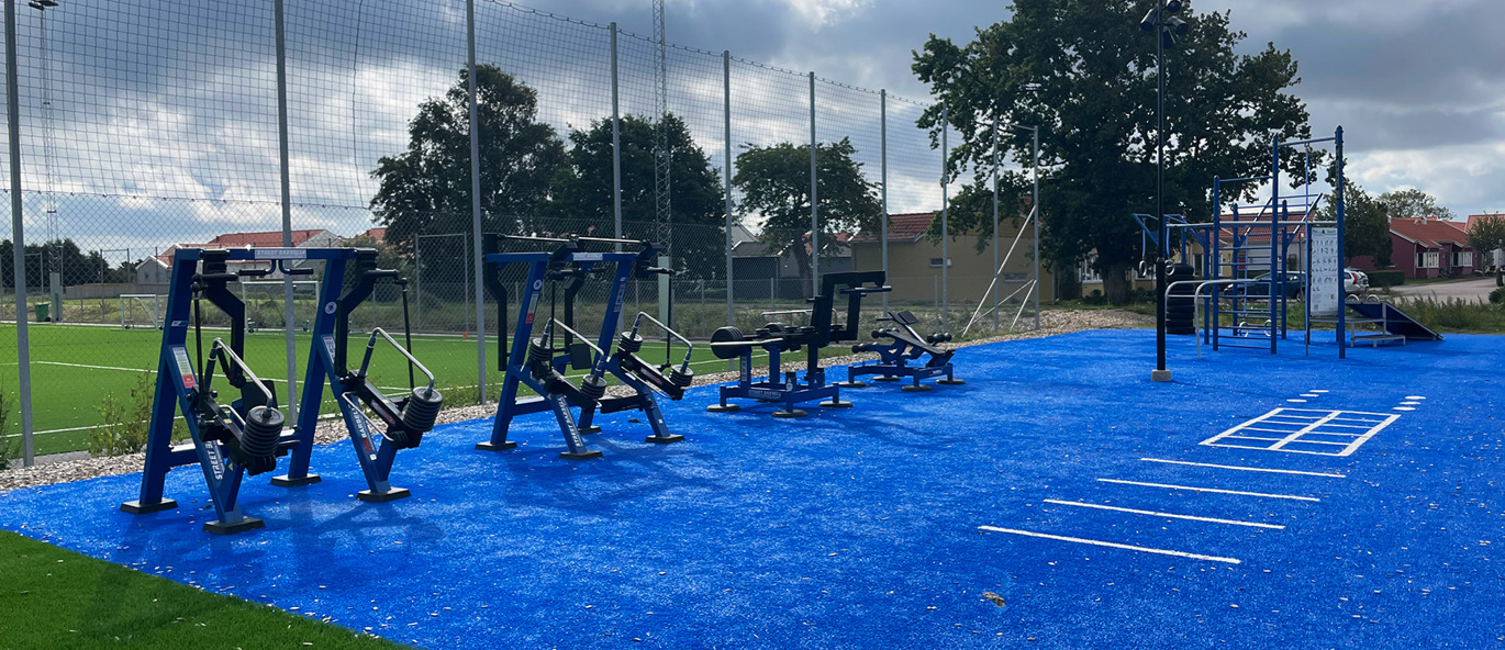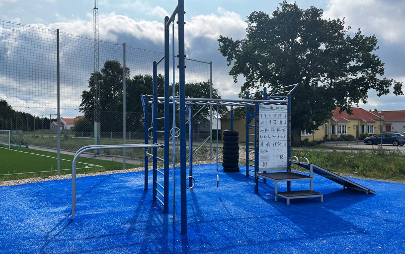 Med hurtig feedback og service fra TRESS blev vi valgt som den samlede leverandør. Produktvalg, placering og support blev diskuteret i fællesskab og resulterede i et klassisk blåt udendørs fitnesscenter med justerbare styrketræningsmaskiner fra Street Barbell og vores populære TRESSFit træningsstativ til øvelser med egen kropsvægt.