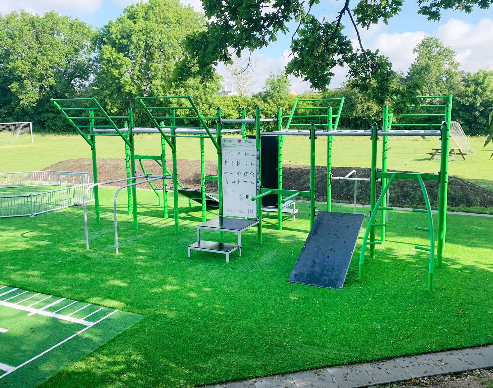 Ved Løjtegårdsskolen i Kastrup ønskede man at udnytte en område ved boldbanerne bag skolen til et aktivitetsområde med plads til udendørs træning og boldspil. Her har vi bl.a. leveret vores populære TRESSfit træningsstativ og en pannabane.