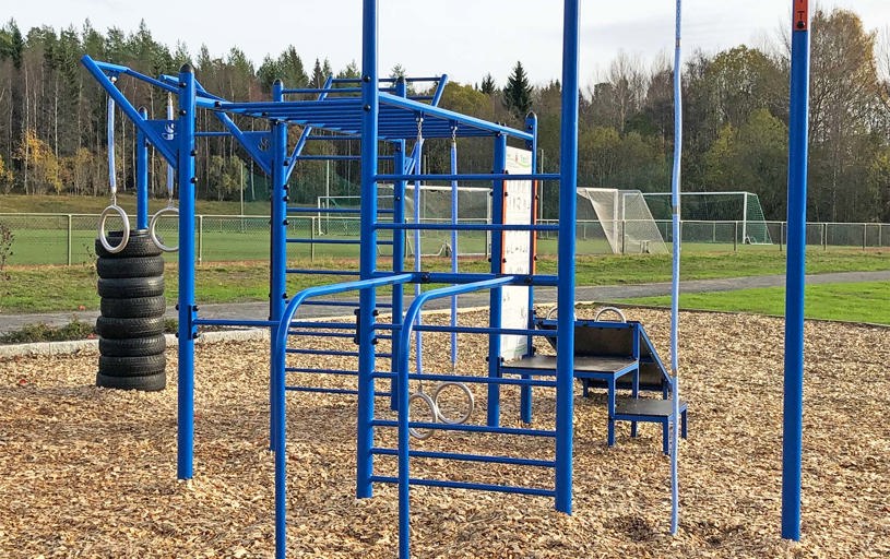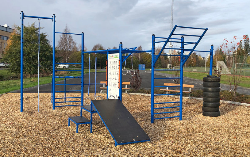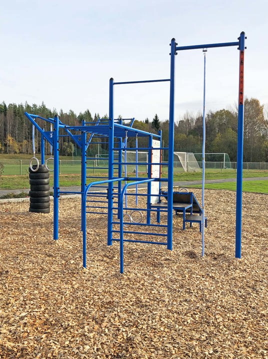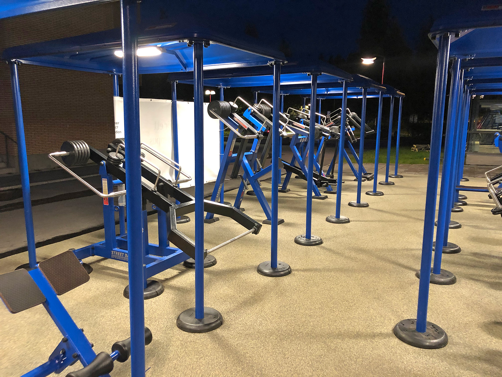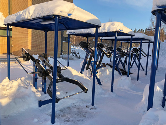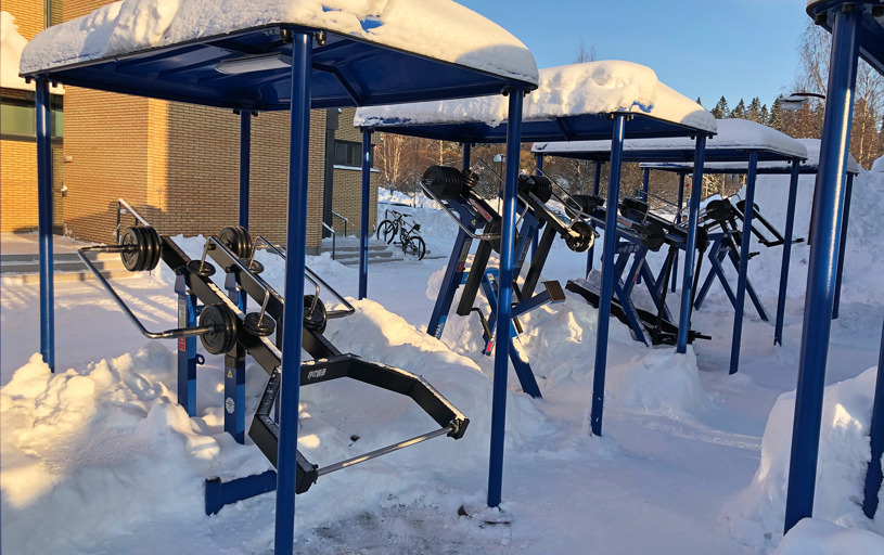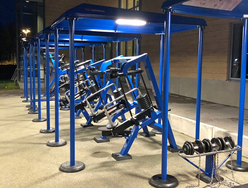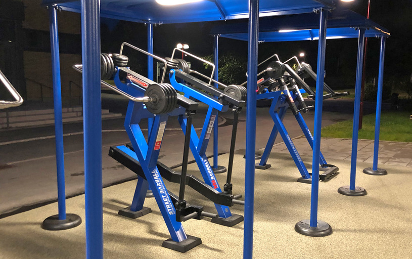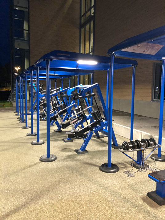 De 10 træningsmaskiner er udstyret med både tag og belysning, hvilket gør, at du kan træne selv i dårligt vejr, og når det er mørkt. Belysningen giver også tryghed for udøveren, da området er godt oplyst. Underlagets gummioverflade giver desuden en stabil følelse, når du træner.