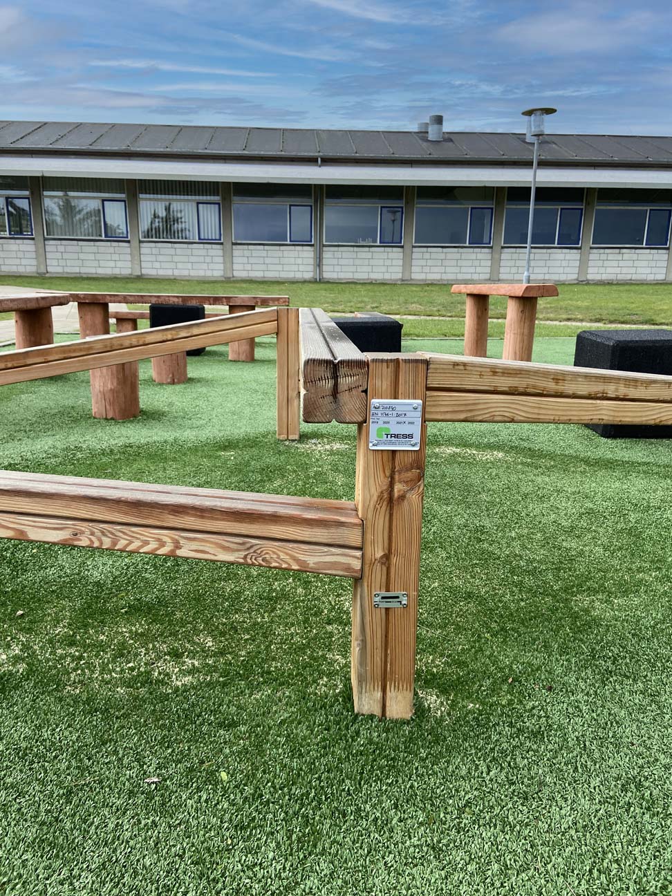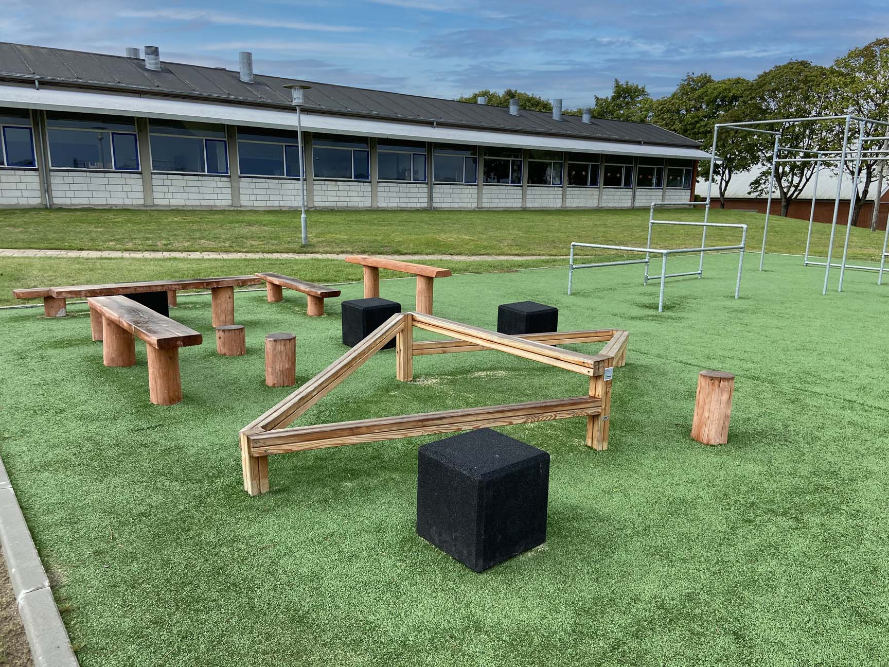 Børnene har rig mulighed for at bevæge sig i områdets parkourstativ samt udfordre balancen på balancebommene og de multifunktionelle gummiblokke. Skulle der undervejs være brug for en slapper, fungerer både balancebomme og gummiblokke også perfekt til et lille hvil.