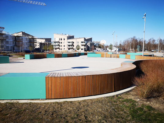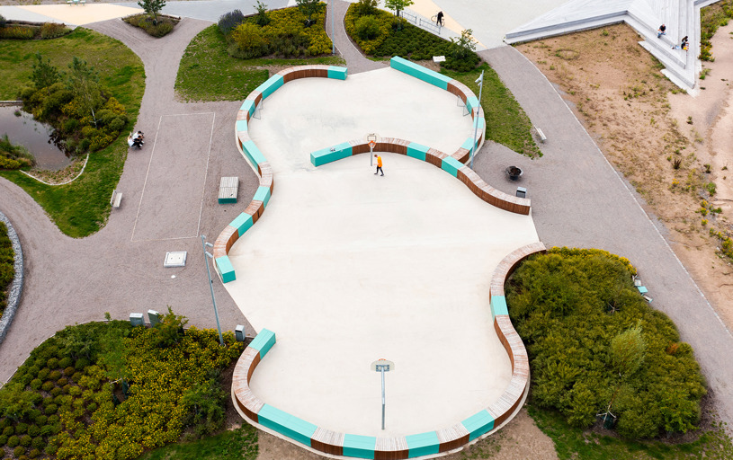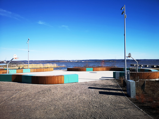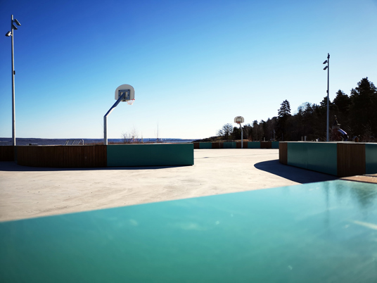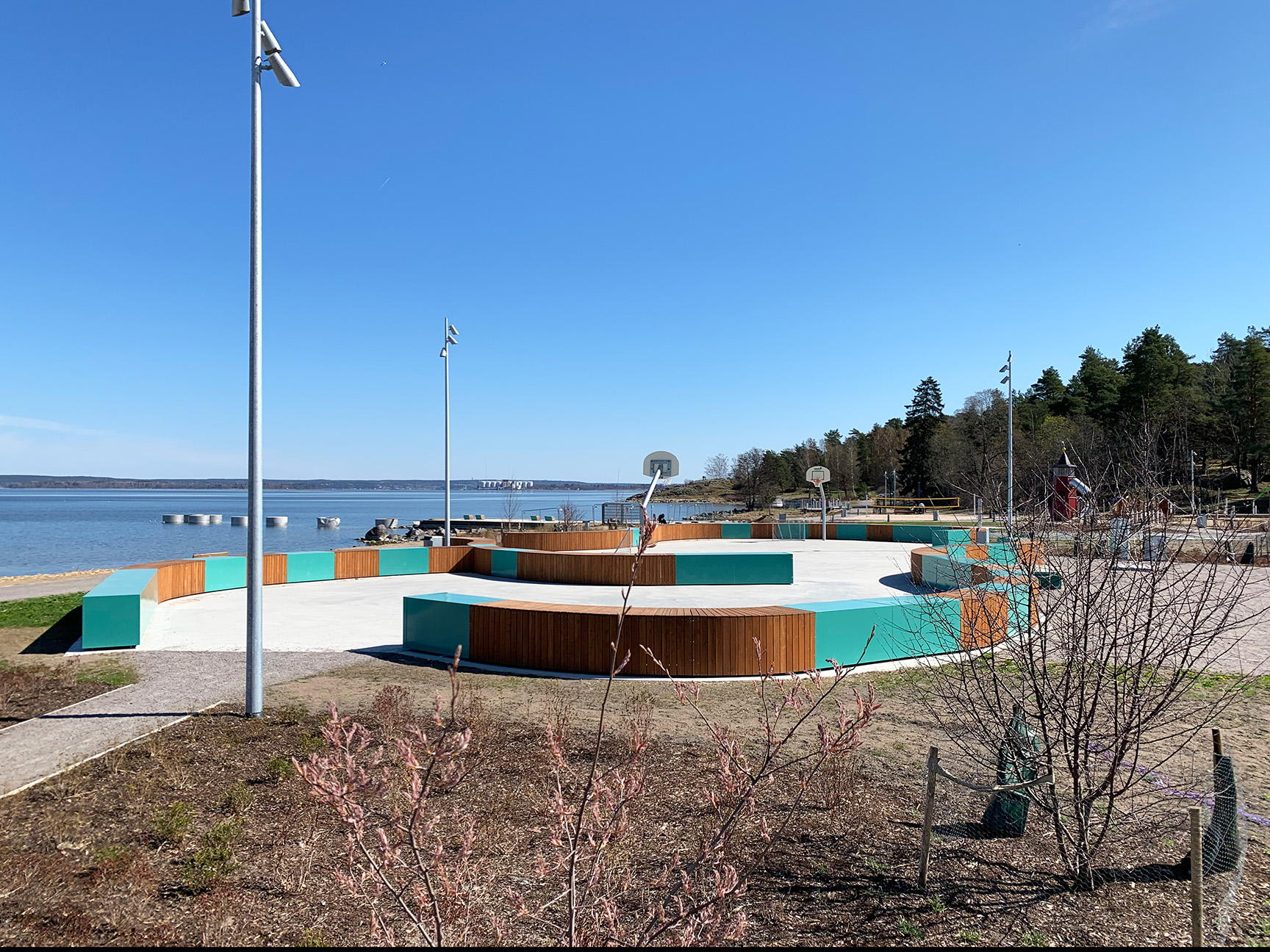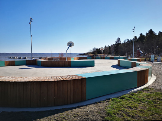 Multiarenaen ved Lindö Strand er skabt af lærke- og stålmoduler. Buede og lige moduler er koblet sammen for at danne et mønster, der minder om havbølger. Kanten fungerer godt som siddepladser. Basketballstativer og minimål giver mulighed for en kamp med vennerne.