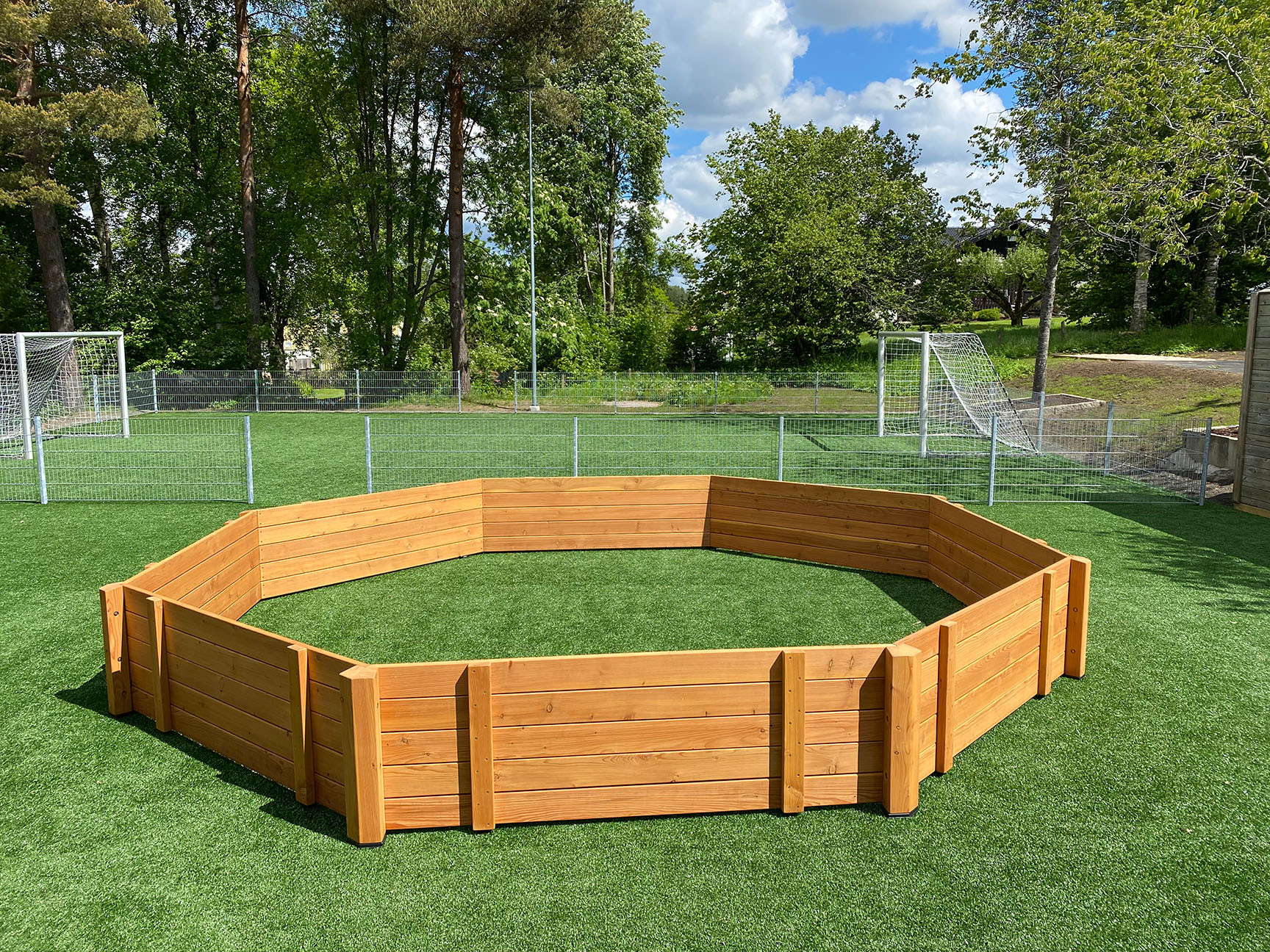 En gagaball bane er ottekantet. Hos TRESS finder du gagaball baner lavet af slidstærkt lærketræ, som tåler det skandinaviske klima rigtig godt. Vi har gagaball baner i flere forskellige størrelser – så hos os kan du helt sikkert finde en gagaball bane, der passer til dit behov.