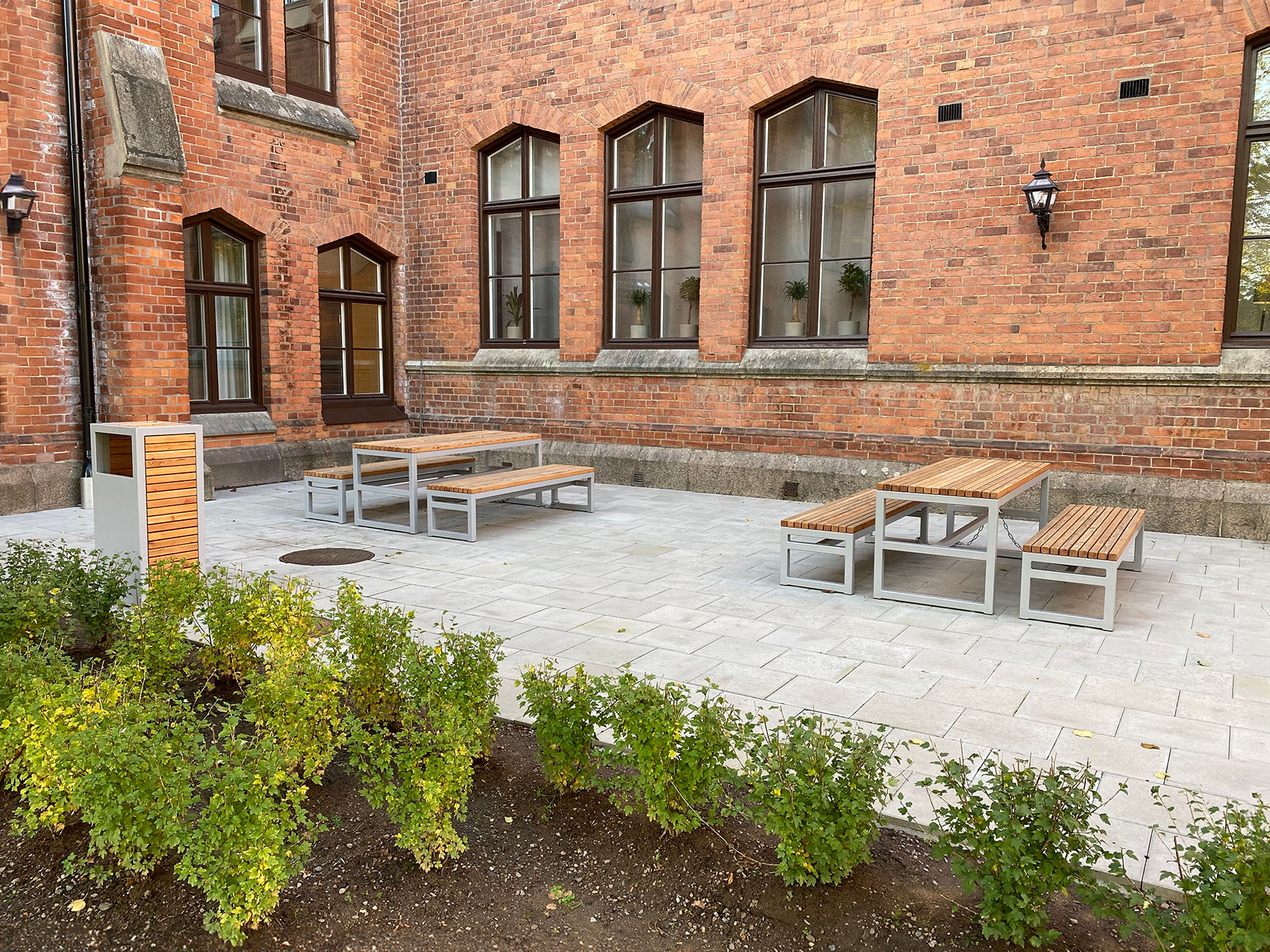 - Træ : Træ er et naturmateriale og bør tilses jævnligt for revner, splinter og generel slitage. Rengør med en blød børste eller fugtig klud. For at forlænge levetiden anbefales det at behandle træet med egnet træbeskyttelsesmiddel efter behov og altid sikre, at kontaktflader mod jord holdes fri for konstant fugt.